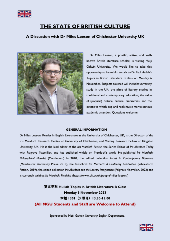 講演会 The State of British Culture: A Discussion with Dr Miles Leeson of Chichester University UK