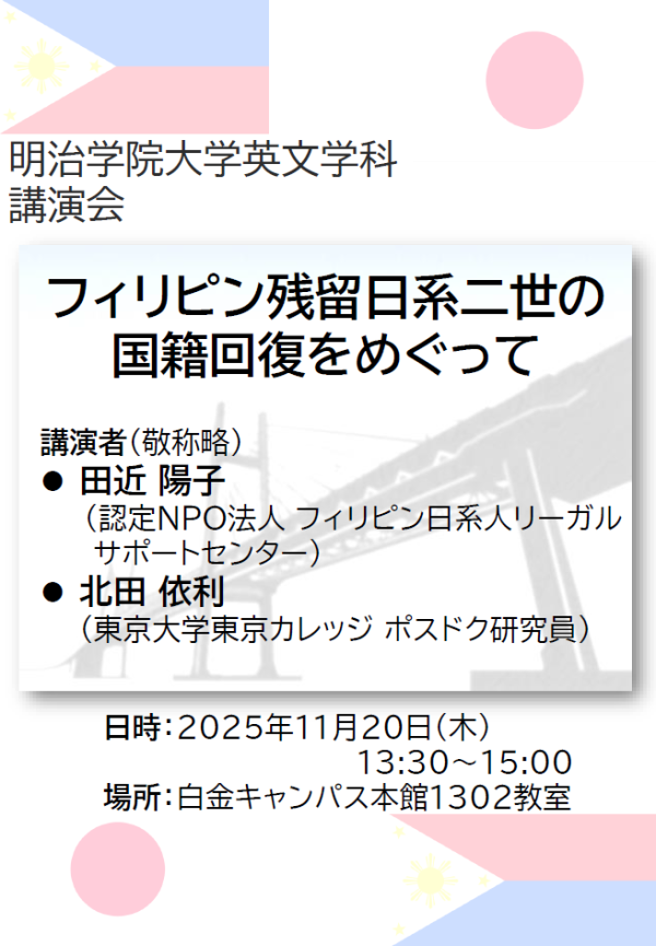 2025/11/04 講演会 フィリピン残留日系二世の国籍回復をめぐって 開催日:2025年11月20日(木)13:30~15:00会場 :白金校舎 本館1302教室講演者:田近 陽子(認定NPO法人 フィリピン日系人リーガルサポートセンター) 北田 依利(東京大学東京カレッジ ポスドク研究員)どなたでも参加できますのでぜひお越しください。 講演会・お知らせ一覧へ戻る