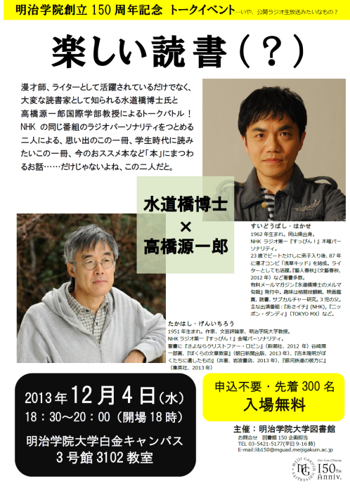 【図書館】【いよいよ本日!】創立150周年記念トークイベント《水道橋博士×高橋源一郎》 “楽しい読書(?)”