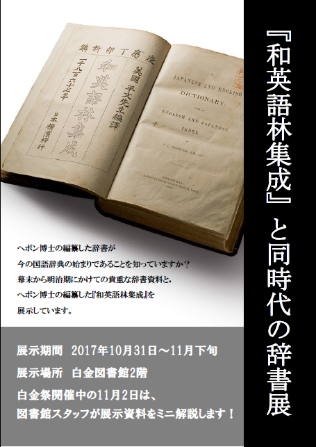 当日は貴重書展示「和英語林集成と同時代の辞書」もご覧いただけるほか、学生スタッフによるツアーや映画上映会も予定しています。