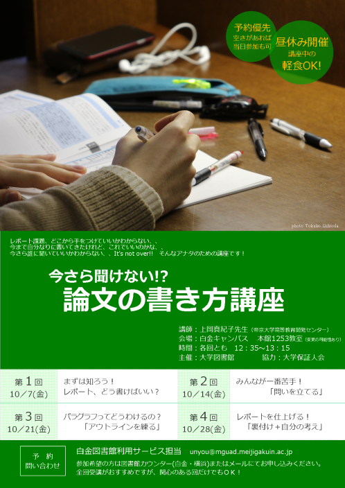 <申込み・問い合わせ> 白金図書館利用サービス担当 unyou@mguad.meijigakuin.ac.jp