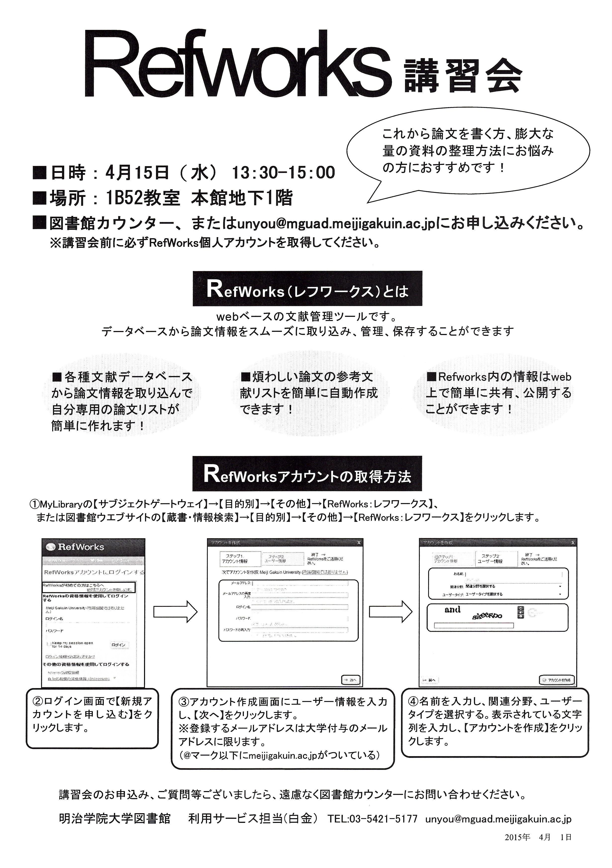 アカウント取得には大学付与のメールアドレスが必要です。学内ネットワークから下記にアクセス下さい。http://www.meijigakuin.ac.jp/library/search/oncampus/Refworks.htm