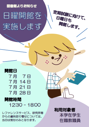 定期試験に向けて、7月は白金・横浜校舎図書館ともに日曜日も開館します。