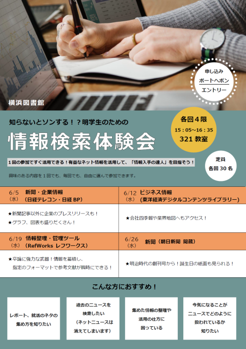 【横浜校舎図書館】知らないとソンする!?明学生のための、情報検索体験会のお知らせ