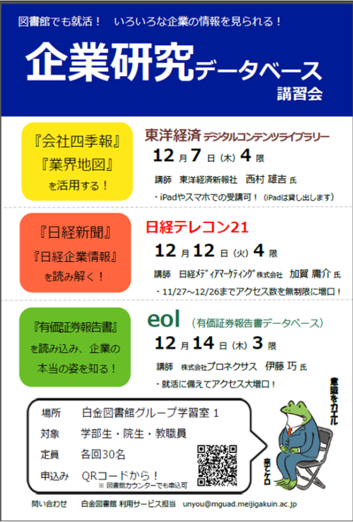 【白金校舎図書館】図書館でも就活! 12月開催 企業研究データベース講習会のお知らせ