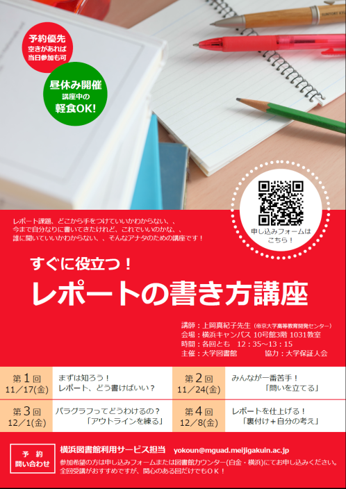 【横浜校舎図書館】「すぐに役立つ!レポートの書き方講座」11/17スタート!