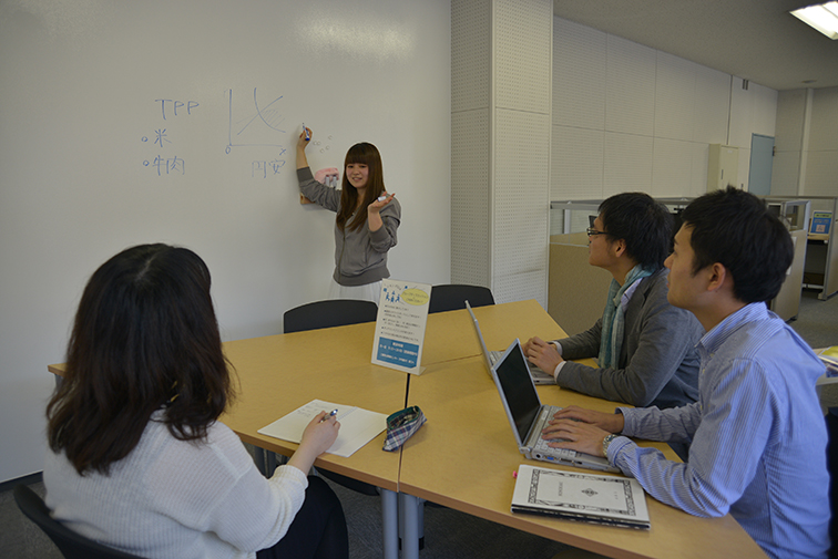 2015年5月18日、25日の2回開催。アクティブコモンズの設備・ツールを授業の事前事後学習でどのように活用できるかを紹介し、教員に授業展開の参考にしていただくため企画しました。「ある講義で課題が出され、次回の授業で調べた内容について発表を行う」という想定のもと、ワークショップ形式で学生サポーターがアクティブコモンズで事前事後学習を行う様子をロールプレイし、新図書館の利活用方法を実感してもらえるよう構成しました。ロールプレイでは、ブレーンストーミング、資料やPCを活用した検索、パワーポイントでのプレゼン資料作成、発表(ワークショップエリアを講義室と仮定してプレゼンテーションを実施)、事後学習(アクティブコモンズの各エリアを活用)の一連の流れを実演しました。
