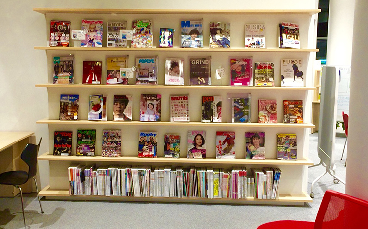 りぶらには改修以前と同様新聞架を設置するとともに、改修前になかった「りぶら雑誌架」を新設し、学術雑誌ではなく、スポーツ、サブカルチャー、ファッション、PCなど学生の身近な雑誌を授業の合間に利用できるよう配架しました。