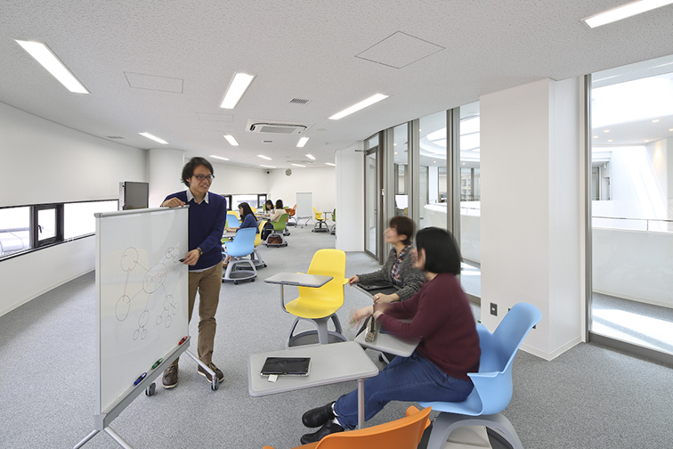 ・建物東側の3部屋(グループ学習室、情報検索スタディルーム、レクチュアルーム)は壁を取り払い一部屋にまとめ、アクティブエリアとした。また通路側の壁をガラス張りにし、「学びの可視化」を実現
