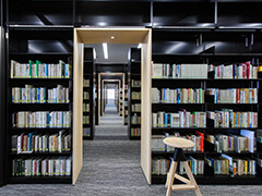 キャンパス中央に位置する図書館は、入口ホールにガラス面を多く使用し、広く、高く、明るい空間を形成。キャンパス同様白色を基調にした躯体に明るい木肌を使い、十分な天井高と豊かな採光による空間的余裕が図書館としての安らぎを出しています。