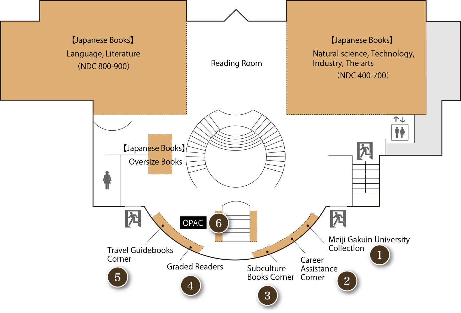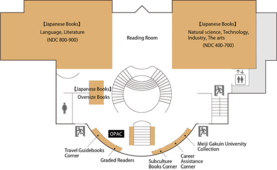 This area contains books for multiple readings, foreign books, movie script books and reference books for language exams.